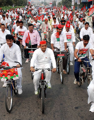 पार्टी झण्डों से सजी साइकिलों पर सवार जोश से भरे हर उम्र, हर धर्म, हर व्यवसाय के जवान, अधेड़