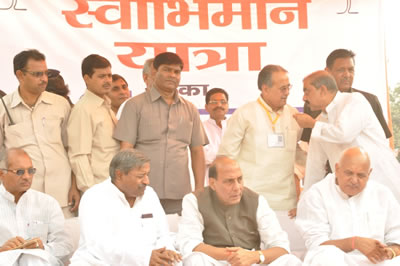 फरीदपुर, बरेली, भारतीय जनता पार्टी के पूर्व राष्ट्रीय अध्यक्ष राजनाथ सिंह ने आज जन स्वाभिमान यात्रा के 9वें दिन अपने संबोधन में कहा कि बसपा सरकार ने अपने कार्यकाल में प्रदेश को दिवालिया बना दिया है। मुख्यमंत्री की आय में बढ़ात्तरी का आलम यह है कि वह देश की सबसे अमीर मुख्यमंत्री बन गई है और उ0प्र0 को कंगाल प्रदेश बना दिया है।  भ्रष्टाचार के खेल में मुख्यमंत्री मालामाल है प्रदेश कंगाल है।