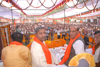 011भारतीय जनता पार्टी के पूर्व राष्ट्रीय अध्यक्ष एवं पूर्व मुख्यमंत्री उ0प्र0 श्री राजनाथ ंिसह ने आज जन स्वाभिमान यात्रा के दूसरे दिन गोंडा में विशाल जनसभा को संबोधित करते हुए प्रदेश की मुख्यमंत्री द्वारा बात-बात पर प्रधानमंत्री को पत्र लिखना जनता को गुमराह करना व धोखा देना बताया। श्री सिंह ने कहा कि एक तरफ प्रदेश की मुख्यमंत्री खाद की कमी को लेकर प्रधानमंत्री को पत्र लिखती है वहीं दूसरी तरफ  जब प्रदेश स्तर पर खाद की उपलब्धता को लेकर विभागीय समीक्षा होती है तो प्रदेश सरकार के सहकारिता मंत्री द्वारा दावा किया जाता है कि खाद की कहीं कोई कमी नहीं है और खाद की उपलब्धता का स्तर 100 फीसदी है। शासन के स्तर पर परस्पर विरोधी स्वर सुनाई दे रहे हैं। जिसका स्पष्टीकरण बसपा सरकार को देना चाहिए।