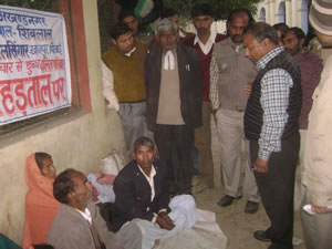 011माया सरकार में दलितों को न्याय मिलने का बस यही अब एक चारा कि भूख हडताल पर बैठना पडे। अपने ही जमीन को पाने के लिए भूखे पेट खुले आसमान के नीचे महिला पुरूश समेत छोटे-छोटे मासूम बच्चों को भी घर से बेघर होकर अधिकारियों के आफिस के सामने बैठने को मजबूर होना पड रहा है। क्या ऐसे ही होगा सर्वजन हिताय और सर्वजन सुखाय।