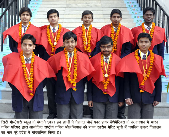 सिटी मोन्टेसरी स्कूल के 13 मेधावी छात्रों ने गणित ओलिम्पयाड की राज्य स्तरीय मेरिट  सूची में चयनित होकर विद्यालय का नाम पूरे प्रदेश में गौरवािन्वत किया है। यह प्रतियोगिता भारत सरकार के एटॉमिक एनर्जी विभाग की ओर से दि नेशनल बोर्ड फार हायर मैथेमैटिक्स के तत्वावधान में भारत गणित परिषद् द्वारा आयोजित की गई। यह जानकारी सी.एम.एस. के मुख्य जन-सम्पर्क अधिकारी श्री हरि ओम शर्मा ने दी है। श्री शर्मा ने बताया कि इस प्रतििष्ठत गणित ओलिम्पयाड में लखनऊ से कुल 15 छात्र चुने गये, जिसमें सर्वाधिक 13 छात्र अकेले सिटी मोन्टेसरी स्कूल से चयनित हुए हैं। सी.एम.एस. से चयनित 13 छात्रों में नवनीत यादव, कृष्णा अग्रवाल, अगम अग्रवाल, विशाल गोयल, दिव्यांश, प्रसन्न दुबे, राहुल त्रिवेदी, मयंक जुनेजा, सिद्धार्थ तिवारी, आलोक शर्मा, प्रियमवद यादव, रोहन विश्वास तथा शुभम श्रीवास्तव शामिल हैं।