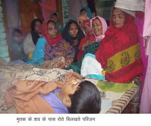 photo_no2मुंगराबादशाहपुर - स्थानीय क्षेत्र थानान्तर्गत मोहल्ला सिपाह में गुरूवार की सुबह सात बजें अचानक दीवाल गिरने से अलाव सेक रहें 13 वशीZय बालक की घटनास्थल पर ही मौत हो गई। इस सम्बंध में प्राप्त विवरण के अनुसार मोहल्ला सराय मछलीगली निवासी मो0 असलम (बुद्धू) का तेरह वषीZय पुत्र मो0 सद्दाम हुसैन गुरूवार की सुबह सात बजें मोहल्ला सिपाह में दीवाल के बगल बैठकर अलाव से हाथ सेक रहा था इतने में अचानक जर्जर दीवाल उसके उपर गिर गई वह उसमें दब गया। मोहल्ले वालो ने किसी तरह उसको बाहर निकाला तब तक वह मर चुका था। घटना की खबर सुनते ही मृतक सददाम के पिता और माता रोती बिलखती सिपाह पहुंची। बच्चे को मरा हुआ देखकर मॉ बाप बेहोश हो गये। सद्दाम 6 भाई और तीन बहने है। शव का पंचनामा कराकर दफना दिया गया।