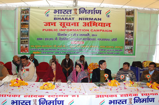 झांसी में चल रहे पत्र सूचना कार्यालय, सूचना एवं प्रसारण मत्रांलय, कानपुर तथा मत्रंालय के अन्य विभागों के सहयोग से डॉ0 आर0 पी0 रिछारिया महाविद्यालय बरूआसागर, झांंसी के प्रांगण में दिनांक 09 जनवरी, 2011 को ´´भारत निर्माण-जन सूचना अभियान´´ के तीसरे दिन समापन समारोह के मुख्य अतिथि पद से बोलते हुऐ झॉसी के मेयर डॉ0 बी0 लाल ने कहा कि सूचना एवं प्रासारण मत्रांलय द्वारा आयोजित यह जन सूचना अभियान आम जन तक सूचना पहुंचानें का सशक्त माध्यम है डॉ0 लाल ने कहा कि समाज और राष्ट्र तभी विकसित होगा जब सरकार द्वारा संचालित सभी योजनाओं की व्यापक स्तर से जानकारी लोगो तक पहंुच जायेगीं। पत्र सूचना कार्यालय एवं क्षेत्रीय प्रचार निदेशालय, लखनऊ के निदेशक श्री अरिमर्दन सिंह ने कहा कि इस अभियान का उद्देश्य आम जनता को सही-सही एवं तथ्य परक जानकारी पहुंचाना है। उन्होंने बताया कि सरकार का उद्देश्य है कि शहरों की भॉति ग्रामीण क्षेत्रों मेें संशाधन विकसित करके ग्रामीण जन का जीवन खुशहाल बनाया जा सकता है। उन्होंने बताया कि एक स्वस्थ्य राष्ट्र की कल्पना तभी की जा सकती है जब यहा के नागरिक मानसिक एवं शारीरिक रूप से स्वस्थ्य हों।