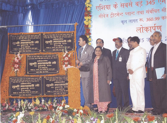 उत्तर प्रदेश की माननीया मुख्यमन्त्री सुश्री मायावती जी 15 जनवरी, 2011 को अपने जन्मदिवस के अवसर पर भरवारा एस0टी0पी0 एवं अन्य सम्बन्धित पिम्पंग स्टेशनों का लोकार्पण करते हुए।
