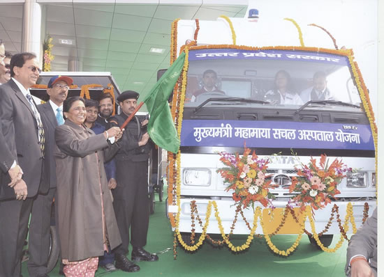 उत्तर प्रदेश की माननीया मुख्यमन्त्री सुश्री मायावती जी 15 जनवरी, 2011 को अपने जन्मदिवस के अवसर पर मुख्यमन्त्री महामाया सचल अस्पताल का शुभारम्भ करते हुए।