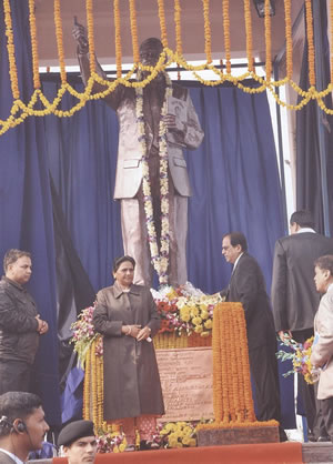 उत्तर प्रदेश की माननीया मुख्यमन्त्री सुश्री मायावती जी 15 जनवरी, 2011 को डॉ0 भीमराव अम्बेडकर सभागार आिशयाना के परिसर में स्थापित परमपूज्य बाबा साहेब डॉ0 भीमराव अम्बेडकर की प्रतिमा के अनावरण के अवसर पर।