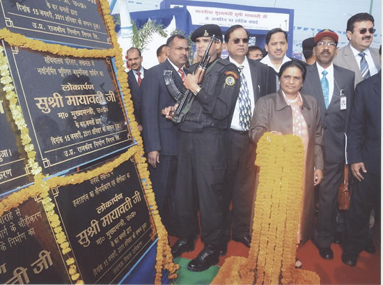 उत्तर प्रदेश की माननीया मुख्यमन्त्री सुश्री मायावती जी 15 जनवरी, 2011 को अपने जन्मदिवस के अवसर पर विभिन्न विकास परियोजनाओं का लोकार्पण एवं िशलान्यास करते हुए।photo-cm-15jan2011