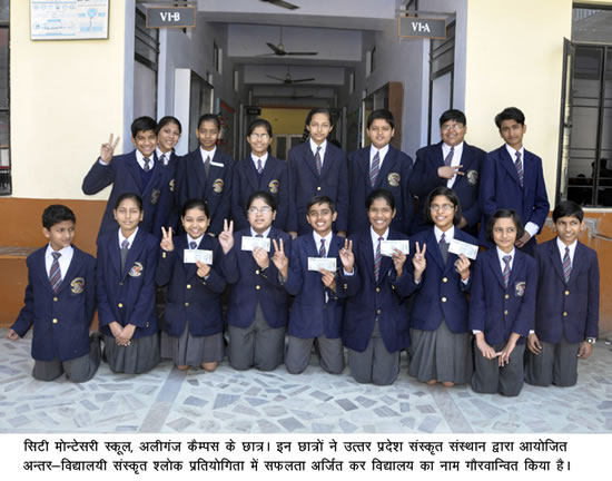 सिटी मोन्टेसरी स्कूल, अलीगंज कैम्पस के 18 छात्रों ने उत्तर प्रदेश संस्कृत संस्थान द्वारा आयोजित अन्तर-विद्यालयी संस्कृत श्लोक प्रतियोगिता में सफलता अर्जित कर विद्यालय का नाम गौरवािन्वत किया है। यह जानकारी सी.एम.एस. के मुख्य जन-सम्पर्क अधिकारी श्री हरि ओम शर्मा ने दी है। श्री शर्मा ने बताया कि उत्तर प्रदेश संस्कृत संस्थान द्वारा भावी पीढ़ी के संस्कृत ज्ञान को विकसित करने एवं संस्कृति विषय के प्रति रुचि जागृत करने के उद्देश्य से यह प्रतियोगिता आयोजित की गई, जिसमें लखनऊ के कई प्रतििष्ठत विद्यालयों के छात्रों ने प्रतिभाग किया। इस प्रतििष्ठत प्रतियोगिता में सी.एम.एस. अलीगंज के मेधावी छात्रों ने न सिर्फ अपने संस्कृत ज्ञान का परचम लहराया अपितु अपनी सांस्कृतिक विरासत का आलोक भी प्रवाहित किया। आयोजकों ने सी.एम.एस. छात्रों की भूरि-भूरि प्रशंसा करते हुए नगद धनराशि के अलावा प्रशस्ति पत्र प्रदान कर सम्मानित किया।