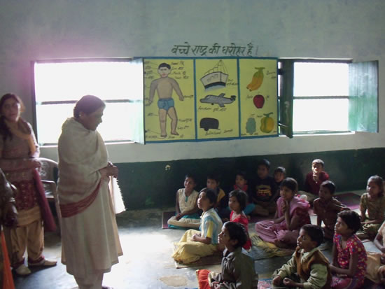 उ0प्र0 की माननीया मुख्यमन्त्री सुश्री मायावती जी 06 फरवरी,2011 को जनपद मैनपुरी में प्राथमिक विद्यालय के छात्र-छात्राओं से पूछताछ करती हुईं।