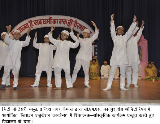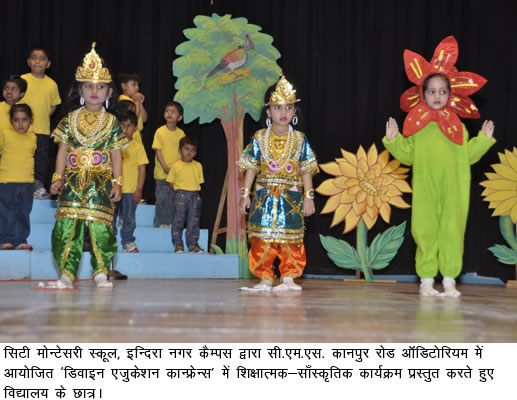 11सिटी मोन्टेसरी स्कूल, इिन्दरा नगर द्वारा “डिवाइन एजुकेशन कान्फ्रेन्स´´ का भव्य आयोजन  आज सी.एम.एस. कानपुर रोड ऑडिटोरियम में किया गया। इस अवसर पर विद्यालय के छात्रों ने ईश्वरीय भक्ति से परिपूर्ण अपने गीत-संगीत से ऐसा समां बांधा कि दर्शक मन्त्रमुग्ध हो गये। प्रार्थना नृत्य ने सबका मन मोह लिया। अभिभावक इन आध्याित्मक गुणों से भरे कार्यक्रम को देखकर गद्गद हो उठे। इस अवसर पर सी.एम.एस. इिन्दरा नगर कैम्पस के नन्हें-मुन्हें छात्रों ने सार्वभौमिक जीवन मूल्यों पर अपने विचार प्रकट किए साथ ही सच्चाई, ईमानदारी, दयालुता, आदर, अनुशासन इत्यादि पर उदाहरण सहित सुन्दर ढंग से अपने विचार रखे। इस अवसर पर विभिन्न प्रतियोगिताओं में स्वर्ण और रजत पदक प्राप्त करने वाले छात्रों एवं वाषिZक परीक्षाओं में प्रथम स्थान प्राप्त करने वाले छात्रों को पुरष्कृत कर सम्मानित किया गया।