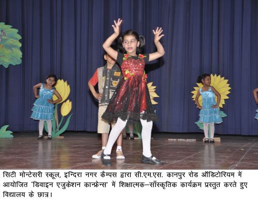 11The Divine Education Conference of City Montessori School, Indira Nagar campus held today at CMS Kanpur Road auditorium. On this occasion, the children presented a beautiful and devotional programme full of divine music, songs and dances, leaving the spectators spellbound. Parents were highly elated to witness the thought-provoking ideas presented by students and the eloquent expression of moral virtues like honesty, caring, respect, cleanliness, self-discipline and obedience. The students who had secured positions in the annual examinations and won gold and silver medals in various competitions were honoured and felicitated on the occasion.