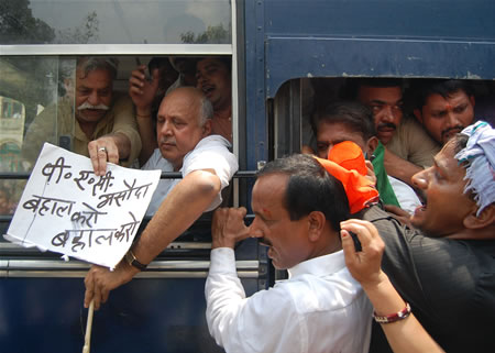 hयूपीए सरकार के कार्यकाल में हुए दे के सबसे बड़े घोटाले 2-जी स्पेक्ट्रम के मामले में लोक लेखा समिति में कांगे्रस के भ्रश्टाचार को सपा व बसपा द्वारा समर्थन दिए जाने से नाराज भाजपा ने आज सपा, बसपा व कांगे्रस के भ्रश्टाचार के विरूद्ध प्रदर्षन करने एवं उनका पुतला जलाने का ऐलान किया था। आज सुबह लगभग 11.30 बजे भाजपा कार्यकर्ता पार्टी के प्रदे मुख्यालय पर बड़ी संख्या में एकत्र हुए। भाजपा कार्यलय से पार्टी कार्यकर्ता प्रदे अध्यक्ष सूर्य प्रताप शाही के नेतृत्व में हाथों में प्ले कार्ड लेकर मायावती, सोनिया गांधी और मुलायम सिंह तथा सपा, बसपा व कांगे्रस के भ्रश्टाचार के मुद्दे पर किए गए गठजोड़ के विरोध में नारेबाजी करते हुए आगे बढ़ने लगे। पुलिस ने भाजपा मुख्यालय को चारो तरफ से बैरिंग कैटिंग लगाकर कार्यकर्ताओं को जबरन बलपूर्वक रोकने का प्रयास किया लेकिन शातिपूर्वक प्रदर्शन करते हुए भाजपा कार्यकर्ता आगे बढ़ने लगे।