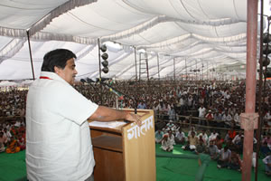 प्रदेश अध्यक्ष सूर्य प्रताप शाही ने विशाल जनसमूह को संबोधित करते हुए कहा कि यह महारैली मायावती सरकार के कुशासन के खात्मे के लिए है। भंेट में मिले त्रिशूल को दिखाते हुए उन्होंने कहा कि इस मदमस्त सरकार पर यह त्रिशूल अंकुश लगाने का काम करेगा। श्री शाही ने कहा कि भाजपा मायावती के अनाचार को कदापि बर्दाश्त नहीं करेगी। भाजपा ने माया सरकार के 100 घोटालांे का पर्दाफाश किया है। माया सरकार उस पर चुप क्यों है? भाजपा आगे भी माया सरकार के घोटालों का पर्दाफाश करती रहेगी। उन्होंने केन्द्र की कांगे्रसी सरकार और उ0प्र0 की माया सरकार को घोटालों की सरकार की संज्ञा देते हुए कहा कि इस घोटाले के लिए कांगे्रस, बसपा और सपा तीनों ही जिम्मेदार हेंै क्योंकि केन्द्र की सरकार के दोनों समर्थक दल हैं। उन्होंने उ0प्र0 की भाजपा सरकार तथा केन्द्र की अटल बिहारी बाजपेई सरकार की उपलब्धियों की विस्तार से चर्चा की। श्री शाही ने कहा कि उ0प्र0 में जनता की खुशहाली के लिए भाजपा प्रयत्नशील है और भाजपा ही इस जंगलराज से प्रदेश को मुक्त दिलाएगी।