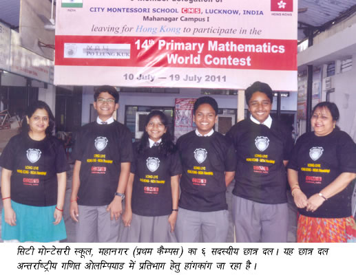 hong-kong-delegationA 6-member students delegation of City Montessori School, Mahanagar (Campus I) will leave for Hong Kong to participate in the International Mathematics Olympiad.  Mr Hari Om Sharma, Chief Public Relations Officer of CMS informed. Mr Sharma informed that this International Mathematics Olympiad is being hosted by the renowned social and educational organization Po Leung Kuk for children under 14 years of age from 10 to 19 July 2011 with the objective to enhance their knowledge and accuracy in maths. Mr Sharma informed that the young mathematicians from CMS Mahanagar campus who are going to participate in this prestigious International Mathematics Olympiad include Master Shobhit Singh, Master Ankit Pradeep, Ms Sneha Singh and Master Prakhar Rao. The team will be led by Ms Anjana Gupta, teacher of CMS Mahanagar while Ms Jyoti Singh will be the deputy leader.