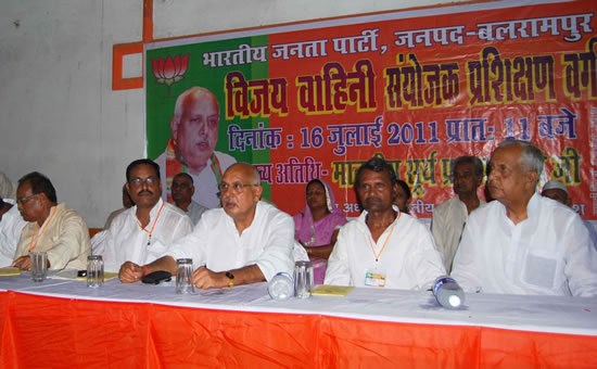 16brp7pपत्रकार वार्ता के दौरान प्रदेश अध्यक्ष ने बलरामपुर नगर में आयोजित विजय वाहिनी प्रमुख प्रशिक्षण कार्यक्रम में कार्यकर्ताओं को संबोधित करते हुए कहा कि कार्यकर्ता पूरे मनोबल से सपा, बसपा और कांगे्रस के सरकारों के कुकर्माें का कच्चा चिट्ठा जन-जन तक पहुंचाने में कोई कसर न छोड़े। कार्यकर्ता मतदाता सूची में की गड़बडियों एवं मतदाताओं के नाम़ बढ़वाने में जुट जाएं। प्रदेश अध्यक्ष ने कार्यकर्ताओं में जबरदस्त उत्साह का संचार किया। कार्यक्रम में पूर्व मंत्री हनुमंत सिंह, प्रदेश उपाध्यक्ष एवं जिला प्रभारी रमापति शास्त्री, पूर्व विधायक विन्दुलाल, प्रदेश मंत्री संतोष सिंह, प्रदेश मीडिया प्रभारी हरिश्चन्द्र श्रीवास्तव, रामकृपाल सिंह, समेत कुसुम चैहान, सुखदेव प्रसाद, चन्द्रप्रकाश सिंह, राकेश सिंह, शैलेन्द्र सिंह शैलू,  कैलाश नारायण, अनूप गुप्ता, हनुमान गढ़ी मन्दिर के उत्तराधिकारी महेन्द्र दास, सरदार परमजीत सिंह, महेश नाराण, रंग बहादुर तिवारी, सूर्य नारायण, शेष नारायण मिश्र, बहरेची गुप्ता, जगदम्बा शंकर, विनय त्रिपाठी अनूप सिंह आदि प्रमुख रूप  से उपस्थित थे।