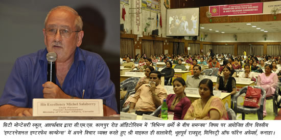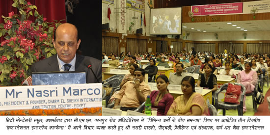 44सिटी मोन्टेसरी स्कूल, अशर्फाबाद द्वारा सी.एम.एस. कानपुर रोड आॅडिटोरियम में आयोजित तीन दिवसीय ‘‘इण्टरनेशनल इन्टरफेथ कान्फ्रेन्स’’ धार्मिक एकता को बढ़ावा देने के संकल्प के साथ आज सायं सम्पन्न हो गई। इस अनूठे अन्तर्राष्ट्रीय सम्मेलन के भव्य समापन समारोह में विश्व के 9 देशों यू.के., कनाडा, ब्राजील, इजिप्ट, श्रीलंका, बांग्लादेश, नेपाल, मलेशिया तथा भारत से पधारे विचारकों, दार्शनिकों, धर्माचार्यों, शिक्षाविद्ों व न्यायविद्ों ने एक स्वर से संकल्प व्यक्त किया कि धार्मिक एकता की स्थापना हेतु सतत् प्रयासरत रहेंगे तथापि सारे विश्व में  खासकर भावी पीढ़ी को धर्म के मर्म से अवगत करायेंगे। इससे पहले रंगारंग समापन समारोह में सी.एम.एस. छात्रों ने ‘सर्व-धर्म प्रार्थना’ प्रस्तुत कर ईश्वरीय एकता व आध्यात्मिक आलोक की अनूठी आभा से देश-विदेश से पधारे विद्वान मेहमानों को सराबोर कर दिया। एक से बढ़कर एक शानदार शिक्षात्मक-साँस्कृतिक कार्यक्रमों की श्रृंखला ने विदेशी मेहमानों को देश की विविधता से परिपूर्ण सांस्कृतिक व धार्मिक विरासत के अनुपम सौन्दर्य से रूबरू कराया तथापि विभिन्नता में एकता की छटा बिखेर कर सभी को मंत्रमुग्ध कर दिया।