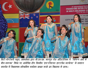 44The three-day International Interfaith Conference organized by City Montessori School, Asharfabad at CMS Kanpur Road auditorium came to a grand conclusion here today with firm resolve by participants to promote religious unity in the world. Religious gurus, intellectuals, educationists, judges and philosophers from nine countries of the world namely UK, Canada, Brazil, Egypt, Sri Lanka, Bangladesh, Nepal, Malaysia and India spoke unanimously that they will continue to make efforts to unite the whole world with the spiritual balm of religion and pave a new way for the younger generation based on love and trust of humanity. Earlier, CMS students enthralled the audience with a delightful array of educational-cultural items. The cultural presentations by the students also carried a flavour of Oneness of Mankind and Unity amidst diversity that forms an integral part of Indian culture and heritage.