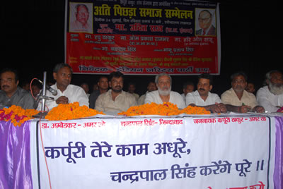 ati-pishra-sammelan-pic-3इसी क्रम को आगे बढ़ाते हुए श्री चन्द्रपाल जी ने कहा ‘‘ हमारे देश में लगभग 35 से 40 प्रतिशत की आबादी पिछड़ों लोगों की है।  यह देश की तरक्की  एवं संपदा निर्माण में एक अहम भूमिका निभाता है, फिर भी आज अपने मौलिक अधिकारों से वंचित है। मण्डल आयोग ने अति पिछड़ों को 15.1 प्रतिशत आरक्षण देने की सिफारिश की थी, लेकिन प्रदेश सरकार की नीतियों के कारण यह अभी तक लागू नहीं हो पाया है। मंच और सम्मेलन में तो सभी कहते पर असली में कोई भी इनका भला नहीं करता है, चाहे वो मायावती जी हों या मुलायम सिंह, सभी अपनी जातियों के, परिवार वार के पक्षधर हैं और अति पिछड़ों के विरूद्ध।  अब समय    आ गया है जब हमें एक साथ कंधा से कंधा मिलाकर चलना होगा और बदलाव लाने की कोशिश करनी होगी।