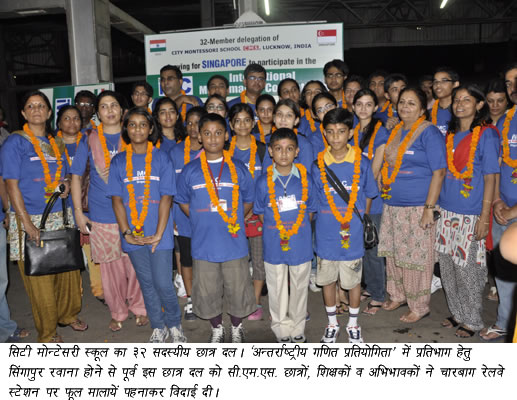सिटी मोन्टेसरी स्कूल का 32 सदस्यीय छात्र दल सिंगापुर में आयोजित हो रहे ‘इण्टरनेशनल मैथमेटिक्स इन्विटेशन कान्टेस्ट’ में प्रतिभाग हेतु सिंगापुर रवाना हो गया। इस छात्र दल में सी.एम.एस. राजाजीपुरम कैम्पस, आर.डी.एस.ओ. कैम्पस एवं गोमती नगर कैम्पस के छात्र शामिल है। इस प्रतिष्ठित अन्तर्राष्ट्रीय प्रतियोगिता में प्रतिभाग हेतु सिंगापुर रवाना होने से पूर्व सी.एम.एस. छात्र दल को विद्यालय के छात्रों, शिक्षकों व अभिभावकों ने चारबाग रेलवे स्टेशन पर फूल मालायें पहनाकर विदाई दी एवं विदेश में देश का गौरव बढ़ाकर लौटने हेतु हार्दिक शुभकामनाएं दी। यह जानकारी सी.एम.एस. के मुख्य जन-सम्पर्क अधिकारी श्री हरि ओम शर्मा ने दी है। श्री शर्मा ने बताया कि यह प्रतियोगिता मैथेमेटिक्स ट्रेनर्स गिल्ड के तत्वावधान में आयोजित की जा रही है, जिसका उद्देश्य भावी पीढ़ी को गणित के समग्र ज्ञान से अवगत कराना है।
