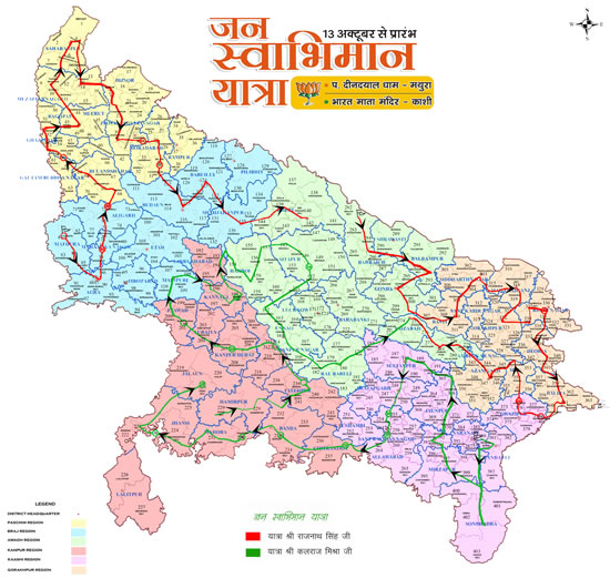 jan-swabhimaan-yatra-route13 अक्टूबर को वाराणसी के भारत माता मंदिर से प्रारम्भ होने वाली राष्ट्रीय उपाध्यक्ष कलराज मिश्र की जन स्वाभिमान यात्रा को पूर्व उप प्रधानमंत्री लालकृष्ण आडवाणी रवाना करेंगे। डा0 मुरली मनोहर जोशी, नरेन्द्र सिंह तोमर, साध्वी उमा भारती, वह स्वयं अनन्त कुमार, ओमप्रकाश सिंह समेत अनेक प्रदेश की वरिष्ठ नेता उपस्थित रहेंगे। इस यात्रा का संयोजक शिव प्रताप शुक्ल को बनाया गया है।