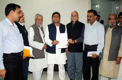 27-11-aसमाजवादी पार्टी के प्रदेश अध्यक्ष श्री अखिलेश यादव से आज सर्वजन हिताय संरक्षण समिति, उत्तर प्रदेश के प्रतिनिधि मण्डल ने भेंटकर उन्हें प्रदेश की बसपा सरकार द्वारा जारी पदोन्नतियों में आरक्षण और परिणामी ज्येष्ठता के आदेश से उत्पन्न विसंगतियों के संबंध में ज्ञापन दिया। श्री यादव ने भरोसा दिलाया कि समाजवादी पार्टी की सरकार बनने पर बसपा सरकार की अवैध और असंवैधानिक व्यवस्थाएं निरस्त कर दी जाएगी। उन्होने कहा कि समाजवादी पार्टी सरकारी कर्मचारियों को माननीय उच्च न्यायालय के 4 जनवरी,2011 के निर्णय की रोशनी में उचित आदेश जारी करेगी। श्री यादव ने कहा कि बसपा सरकार के सन् 2002 के आदेश को श्री मुलायम सिंह यादव ने समाजवादी पार्टी सरकार में सन् 2005 में निरस्त कर दिया था जिसे बसपा सरकार ने फिर सन् 2007 से लागू कर दिया है। समाजवादी पार्टी की सरकार कर्मचारियों-अधिकारियों का अहित नहीं होने देगी।
