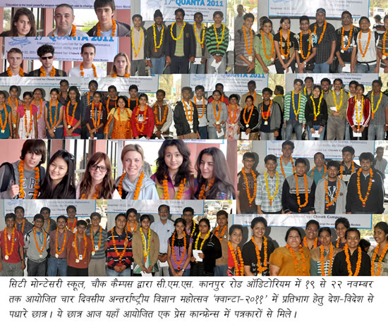 teams-of-quantaStudents teams from India and abroad continue to arrive at Lucknow to participate in the 4-day International Science Festival ‘Quanta-2011′ being organized by City Montessori School, Chowk campus. This International Science Festival will be starting tomorrow on 19 November at 10.00 am at CMS Kanpur Road auditorium. This information has come from Mr Hari Om Sharma, Chief Public Relations Officer of CMS. Mr Sharma informed that today the students’ teams of Germany, Bulgaria, Russia, Lebanon, Finland, Canada, Jordan and various parts of India have arrived at Lucknow who were given a warm reception with flower garlands. The young scientists seemed very happy and enthusiastic on reaching Lucknow and were very impressed by the welcome they received. Students’ teams from foreign countries which arrived today include Heidehof Stiftung, Germany; Lyceum Artis, Bulgaria; Salavic-Anglo-Amrican School, Russia; Cedas Cultural School, Lebanon; Tapiola High School, Finland; King Hossein Jubilee School, Jordan etc.