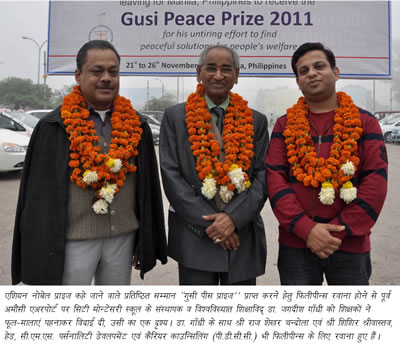 philippines-journey_jgविश्व शान्ति के प्रबल समर्थक व सिटी मोन्टेसरी स्कूल के संस्थापक, प्रख्यात शिक्षाविद् डा. जगदीश गाँधी एशियन नोबेल प्राइज कहे जाने वाले फिलीपीन्स के अत्यन्त प्रतिष्ठित सम्मान ‘‘गुसी पीस प्राइज’’ प्राप्त करने हेतु आज फिलीपीन्स की राजधानी मनीला रवाना हुए, जहाँ आगामी 24 नवम्बर को फिलीपीन्स के राष्ट्रपति महामहिम श्री बेनीगनो एस. एक्युनो-तृतीय प्रख्यात भारतीय हस्तियों डा. जगदीश गाँधी एवं पश्चिम बंगाल के महामहिम राज्यपाल श्री एम.के. नारायणन को ‘‘गुसी पीस प्राइज’’ प्रदान कर सम्मानित करेंगे। यह जानकारी