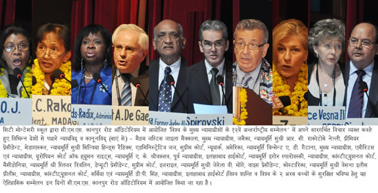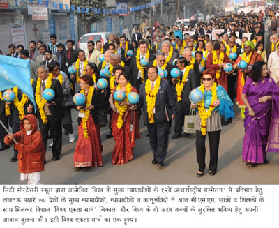 सिटी मोन्टेसरी स्कूल, आॅडिटोरियम में आयोजित हो रहे ‘‘विश्व के मुख्य न्यायाधीशों के 12वें अन्तर्राष्ट्रीय सम्मेलन’’ के तीसरे दिन आज 70 देशों से पधारे मुख्य न्यायाधीशों, न्यायाधीशों और शान्ति प्रचारकों ने ‘‘अन्तर्राष्ट्रीय कानून व्यवस्था’’ का खुलकर समर्थन करते हुए कहा कि ‘अन्तर्राष्ट्रीय कानून व्यवस्था’ लागू करना समय की मांग है क्योंकि इसी व्यवस्था के जरिए विश्वव्यापी समस्याओं का समाधान निकाला जा सकता है। इस ऐतिहासिक अन्तर्राष्ट्रीय सम्मेलन के तीसरे दिन आज 70 देशों से पधारे न्यायविदों व कानूनविदों ने जमकर चर्चा परिचर्चा की और ‘विश्व के 2 अरब बच्चों के सुरक्षित भविष्य’ एवं ‘प्रभावशाली अन्तर्राष्ट्रीय कानून’ पर व्यापक विचार-विमर्श किया, साथ ही साथ सी.एम.एस. छात्रों व शिक्षकों के विशाल ‘विश्व एकता मार्च’ का नेतृत्व कर विश्व एकता, विश्व शान्ति व भावी पीढ़ी के सुरक्षित भविष्य की जोरदार वकालत की। इससे पहले आज प्रात.कालीन सत्र का शुभारम्भ एमीरिटस के मुख्य न्यायाधीश एवं यूरोपियन कोर्ट आॅफ ह्यूमन राइट्स के न्यायाधीश न्यायमूर्ति विन्सेन्ट ए. डी. गैटानो ने किया जबकि समारोह की अध्यक्षता मैसीडोनिया से पधारे काॅस्टीट्यूशनल कोर्ट के प्रेसीडेन्ट न्यायमूर्ति ब्रांको नाओमास्की ने की। इस अवसर पर सी.एम.एस. छात्रों ने विश्व के न्यायविदों के समक्ष विश्व के दो अरब बच्चों की ओर से ‘सुरक्षित भविष्य’ की अपील प्रस्तुत की।
