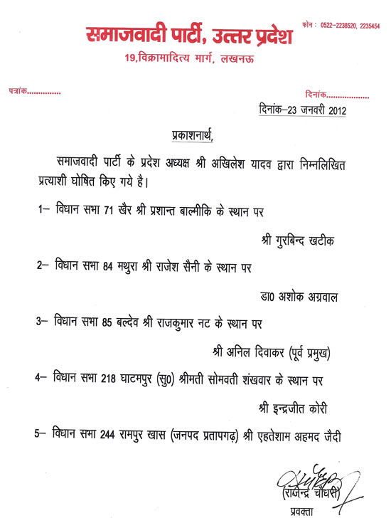 Samajwadi Party Candidate List(Updated)