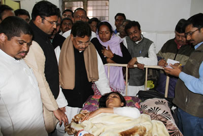 photo-kajal-nishd-at-gorakhpur-hospital-and-pl-punia-and-ashok-tanwar-both-are-mpगोरखपुर देहात से कंाग्रेस चुनाव लड़ रही कंाग्रेस प्रत्याशी श्रीमती काजल निषाद पर बसपा प्रत्याशी और उनके समर्थकों द्वारा कल दिनांक 04फरवरी को महावीर छपरा के पास किये गये हमले से यह जाहिर हो गया है कि जनसमर्थन न मिलने से हतोत्साहित बसपा और उसके समर्थक आक्रामक होकर कंाग्रेस प्रत्याशी, महिलाओं और कार्यकर्ताओं पर हमले करने पर उतारू हो गये हैं। कंाग्रेस पार्टी इसकी कड़े शब्दों में निन्दा करती है और इसमें शामिल लोगों के खिलाफ तत्काल कठोर कार्यवाही किये जाने की मांग करती है।
