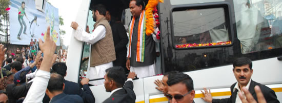 photo-rahul-gandhi-3_r2_c1उत्तर प्रदेष की तस्वीर और तकदीर बदलने के लक्ष्य को लेकर निकले कांग्रेस महासचिव राहुल गांधी का रथ आज शाम उत्तर विधानसभा क्षेत्र मंे पहुंचा जहां से कांग्रेस ने वरिष्ठ समाजसेवी एवं कांग्रेस व्यापार प्रकोष्ठ के चेयरमैन डा. नीरज बोरा को अपना सेनापति बनाया है। कैण्ट, पष्चिम और मध्य विधानसभा होते हुये राहुल गांधी का काफिला उत्तर क्षेत्र के चैक स्थित एतिहासिक गोल दरवाजा पहुंचा जहां पार्टी प्रत्याषी डा. नीरज बोरा ने हजारों समर्थकों के साथ फूल मालाओं से स्वागत किया। महिलाओं ने छतों से पुष्प वर्षा कर राहुल गंाधी का अभिवादन किया।