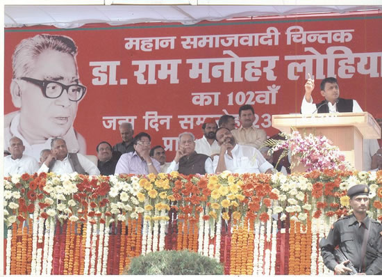 मुख्यमंत्री आज डा0 राम मनोहर लोहिया के 102वें जन्मदिन पर यहां डा0 राम मनोहर लोहिया पार्क में आयोजित ‘‘विचार सम्मेलन’’ में अध्यक्ष की हैसियत से अपने विचार व्यक्त कर रहे थे। इससे पूर्व उन्होंने पार्क में डा0 राम मनोहर लोहिया की प्रतिमा पर माल्यार्पण कर उन्हें नमन किया। इस अवसर पर समाजवादी पार्टी के राष्ट्रीय अध्यक्ष श्री मुलायम सिंह यादव ने भी डा0 लोहिया की प्रतिमा पर माल्यार्पण किया।
