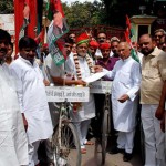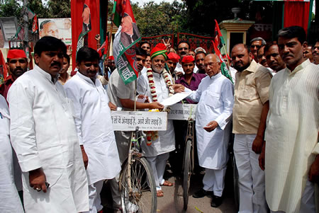 उत्तर प्रदेश पिछड़ा वर्ग संघ के भदोही जिला के कार्यकर्ता प्रदेश अध्यक्ष श्री सुरेन्द्र सिंह यादव, प्रदेश महासचिव श्री सुखराम सिंह के नेतृत्व में 350 किलोमीटर साइकिल चलाकर आज विधान सभा चुनावों में समाजवादी पार्टी की सफलता की बधाई देने के लिए लखनऊ पहुॅचे। उन्होने समाजवादी पार्टी कार्यालय में प्रदेश प्रवक्ता राजेन्द्र चैधरी से भेंट की और उन्हें प्रदेश अध्यक्ष श्री अखिलेश यादव के नाम एक ज्ञापन सौंप कर उपेक्षित जातियों को सम्मान एवं सुविधाएं दिए जाने की मांग की।