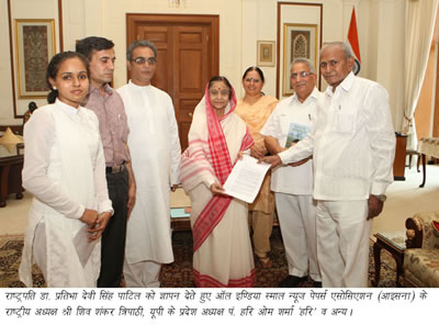 aisna-1आॅल इण्डिया स्माल न्यूज पेपर्स एसोसिएशन (आइसना) के प्रतिनिधि मंडल ने नई दिल्ली स्थित राष्ट्रपति भवन में राष्ट्रपति डा. प्रतिभा देवी सिंह पाटिल से मुलाकात कर लघु समाचार पत्रों की कठिनाइयों से अवगत कराते हुए ज्ञापन सौंपा। महामहिम राष्ट्रपति से हुई मुलाकात में आइसना के राष्ट्रीय अध्यक्ष श्री शिव शंकर त्रिपाठी, यूपी के प्रदेश अध्यक्ष पं. हरि ओम शर्मा ‘हरि’, राष्ट्रीय महामंत्री सुश्री आरती त्रिपाठी, विधि सलाहकार श्री दिलबाग सिंह आदि ने राष्ट्रपति महोदया को छोटे व बड़े अखबारों के बीच की विसंगतियों समेत कई अन्य समस्याओं से अवगत कराया, जिन्हें राष्ट्रपति डा. पाटिल से बड़ी गंभीरता सुना व शीघ्र निस्तारण हेतु सूचना व प्रसारण मंत्रालय को ज्ञापन अग्रसारित करने का आश्वासन दिया।