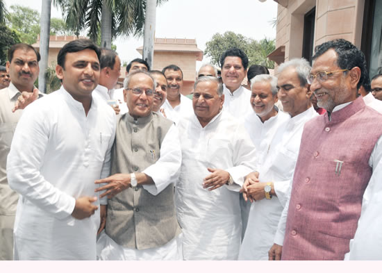 उ0प्र0 के मुख्यमंत्री श्री अखिलेश यादव 03 जुलाई, 2012 को अपने सरकारी आवास 5, कालिदास मार्ग, लखनऊ पर राष्ट्रपति पद के उम्मीदवार श्री प्रणव मुखर्जी का अभिनन्दन करते हुए।