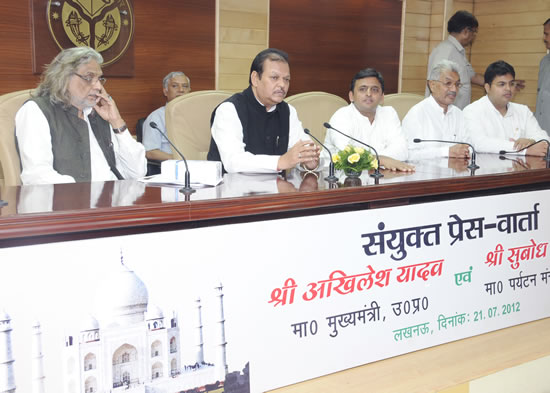 up-cm-shri-akhilesh-yadav-with-shri-subodh-kant-sahayminister-for-tourism1उत्तर प्रदेश में पर्यटन की असीम सम्भावनाओं का लाभ उठाने एवं प्रभावी प्रचार-प्रसार के लिए भारत सरकार एवं उत्तर प्रदेश पर्यटन विभाग के संयुक्त तत्वावधान में पहली बार आज यहां शास्त्री भवन, लखनऊ में बैठक सम्पन्न हुई, जिसमें केन्द्रीय पर्यटन मंत्री श्री सुबोध कान्त सहाय तथा मुख्यमंत्री श्री अखिलेश यादव ने भाग लिया। इस अवसर पर पर्यटन सेवा से जुड़े संगठनों के पदाधिकारियों ने विभिन्न समस्याओं से अवगत कराकर इनके समाधान का आग्रह किया।