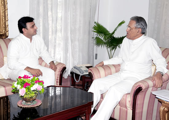 उत्तर प्रदेश के महामहिम राज्यपाल श्री बी0एल0 जोशी से 21 जुलाई, 2012 को राजभवन, लखनऊ में भेंट वार्ता करते हुए प्रदेश के मुख्यमंत्री श्री अखिलेश यादव।