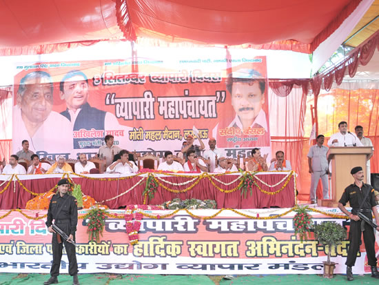 बाद में एक अन्य कार्यक्रम में मुख्यमंत्री श्री अखिलेश यादव ने मोती महल लान, लखनऊ में आयोजित व्यापारी महापंचायत में आज घोषणा की कि प्रदेश में व्यापारियों का उत्पीड़न नहीं होने दिया जाएगा। इंस्पेक्टर राज को हाबी नहीं होने दिया जाएगा। उनकी समस्याओं का समाधान होगा। बिजली संकट दूर किया जाएगा। योजनाओं का पैसा व्यापारियों के पास जाएगा।