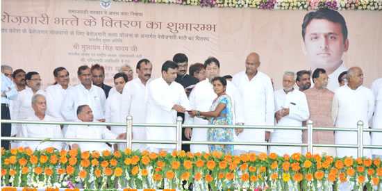 02मुख्यमंत्री आज यहां काॅल्विन तालुकेदार्स काॅलेज में आयोजित एक कार्यक्रम में उत्तर प्रदेश बेरोजगारी भत्ता योजना, 2012 के तहत बेरोजगारी भत्ते के वितरण का शुभारम्भ करने के बाद अपने विचार व्यक्त कर रहे थे। उन्होंने कहा कि इस योजना के शुभारम्भ से चुनाव में जनता से किए गए एक और वायदे को पूरा करने में प्रदेश सरकार सफल हो गई है। श्री यादव ने कहा कि इतने कम समय में बेरोजगारी भत्ते का वितरण, वायदों को पूरा करने के प्रति उनकी सरकार की प्रतिबद्धता को दर्शाता है।