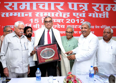 hindi-media-center-1hindi-media-centerप्रेस परिषद् के अध्यक्ष जस्टिस मार्कण्डेय काटजू का नागरिक अभिनन्दन हिन्दी समाचार पत्र सम्मेलन की ओर से मुख्यमंत्री आवास पर हुआ। हिन्दी समाचार पत्र सम्मेलन द्वारा इस अवसर पर एक सम्मान पत्र भेंट किया गया और शाल ओढ़ाकर सम्मान किया गया। वरिष्ठ पत्रकारों की मौजूदगी में मुख्यमंत्री अखिलेश यादव ने जस्टिस काटजू का नागरिक अभिनन्दन किया। इस अवसर पर स्वास्थ्य मंत्री अहमद हसन, राजस्व मंत्री अम्बिका चैधरी, समाज कल्याण मंत्री अवधेश प्रसाद, समाजवादी पार्टी के प्रवक्ता राजेन्द्र चैधरी, हिन्दी समाचार पत्र सम्मेलन के संरक्षक शीतला सिंह, अध्यक्ष उत्तम चन्द्र शर्मा, उपाध्यक्ष राजीव अरोड़ा, व अन्य पदाधिकारीगण व प्रदेष के विभिन्न अंचलों से आये सम्पादकगण व पत्रकार मौजूद थे। हिन्दी समाचार पत्र सम्मेलन की महामंत्री सुमन गुप्ता ने मुख्यमंत्री को संस्था की ओर से स्मृतिचिन्ह भेंट किया। बुन्देलखण्ड से आये संस्था के कोषाध्यक्ष प्रदीप जैन ने मुख्यमंत्री को झांसी की प्रतिमा भेंट की तो मुख्यमंत्री ने कहा कि ‘मैंने रानी झांसी के नाम से एक योजना आरम्भ की है।’
