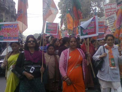 up-bjp-womens1दिल्ली गैंगरेप तथा महिलाओं के साथ हो रहे दुष्कर्म के विरोध में भारतीय जनता पार्टी लखनऊ महानगर महिला मोर्चा की सैकड़ांे कार्यकर्ताआंे ने नगर अध्यक्ष मनोहर सिंह तथा महिला मोर्चा अध्यक्ष बीना गुप्ता के नेतृत्व में नगर कार्यालय कैसरबाग से जीपीओ हजरतगंज तक पैदल मार्च किया। महामहिम राष्ट्रपति को सम्बोधित पांच सूत्रीय ज्ञापन एसीएम प्रथम विनोद कुमार को सौंपा। इस दौरान महिलाओं महिला ने उत्पीड़न बंद करने तथा गैंगरेप के आरोपियों को फांसी देने के नारे लगायें।