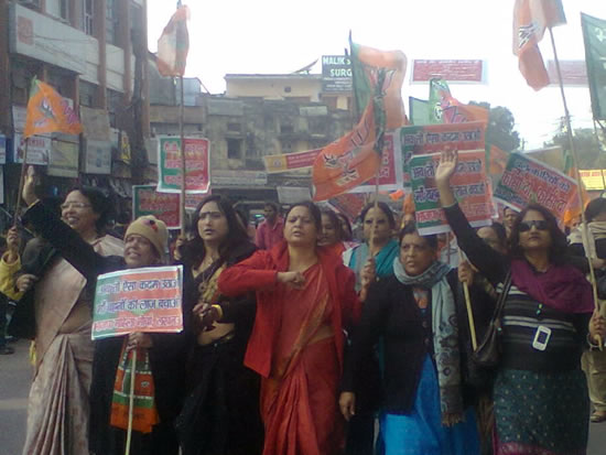 up-bjp-womensभाजपा नगर अध्यक्ष मनोहर सिंह ने कहा कि देश की राजधानी दिल्ली में जिस तरीकें से चलती बस में छात्रा के साथ गैंगरेप हुआ इससे पूरा देश शर्मिंदा है। आज भी देश की राजधानी में ऐसी घटनाएं हो रही हैं परन्तु यूपीए सरकार तथा दिल्ली की कांग्रेस सरकार मौन है। महिलाओं की सुरक्षा की मांग को लेकर उन्होंने कहा कि यूपीए सरकार  की नाक के नीचे दिन प्रतिदिन घटनाएं हो रही है और दोनों सरकारंे हाथ पे हाथ रखकर बैठी हैं। देश की आत्मा को झकझोरने और जनमानस की चेतना को जगाने वाली सामूहिक दुष्कर्म की शिकार छात्रा सदा के लिये सो गयी। दिल्ली गैंगरेप की घटनाओं से भारत वर्ष की महिलाएं आक्रोशित हैं। दिल्ली गैंगरेप पीडि़ता को इंसाफ दिलाने की मांग को लेकर भाजपा महिला मोर्चा सड़क पर उतरकर संघर्ष कर रहा है। उत्तर प्रदेश में 19 दिसम्बर, 2012 से 27 दिसम्बर, 2012 तक महिलाओं के साथ बलात्कार की घटनाओं की समाचार पत्रों में जो प्रकाशित हुयीं वह जग जाहिर है। महिला मोर्चा की नगर अध्यक्ष बीना गुप्ता ने कहा कि महामहिम राष्ट्रपति को भेजे गये ज्ञापन में हमने लोकसभा का विशेष सत्र आहुत कर बलात्कारियों को मौत की सजा देने की व्यवस्था की जाय, पूर्व गृहमंत्री पी. चिदम्बरम के अनुमोदन पर सुप्रीम कोर्ट ने बलात्कारियों को फांसी की सजा देने के बाद पांच अपराधियों को महामहिम राष्ट्रपति से सजा माफ करायी। इसलिये वह तत्काल इस्तीफा दें, बलात्कारी मुकदमें की सुनवाई फास्ट ट्रैक कोर्ट द्वारा की जाय, बलात्कारी मुकदमें की सुनवाई महिला जज द्वारा की जाय, उत्तर प्रदेश सरकार में बलात्कार व महिलाओं पर अत्याचार करने वाले मंत्री व विधायकों को बर्खास्त किया जाय। प्रदेश महामंत्री, नीलम सोनकर एवं कमलावती सिंह ने भी दिल्ली गैंगरेप प्रकरण में केन्द्र एवं शीला सरकार की घोर निन्दा करते हुये महिलाओं की सुरक्षा करने की मांग।