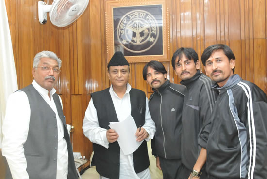 उत्तर प्रदेश के नगर विकास मंत्री मो0 आजम खाँ दिनांक 14 दिसम्बर, 2012 को विधान भवन स्थित अपने कार्यालय कक्ष में विश्व शान्ति पद यात्रा के सदस्य सर्वश्री जितेन्द्र प्रताप, महेन्द्र प्रताप एवं गोविन्दानन्द से मुलाकात करते हुये।