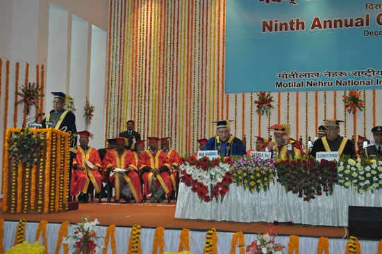 राष्ट्रपति कल मोतीलाल नेहरू राष्ट्रीय प्रौद्योगिकी संस्थान (एम.एन.एन.आई.टी.) इलाहाबाद में आयोजित नवम् वार्षिक दीक्षान्त समारोह को मुख्य अतिथि के रूप में सम्बोधित कर रहे थे। उन्होंने कहा कि यद्यपि वैश्विक, आर्थिक मंदी के कारण देश की विकास दर कुछ घटी है। लेकिन अपने लचीलेपन के कारण देश इस संकट का सामना आसानी से कर लेगा। उन्होंने कहा कि भारत की आर्थिक तरक्की के महत्वपूर्ण कारकों में उच्च शिक्षा संस्थान भी महत्वपूर्ण हैं, जो स्वतंत्रता के बाद देश में स्थापित किए /president-pranabh-mukharji-in-mnnit-allahabad-with-up-governor-b-l-joshi-2गए।\श्री मुखर्जी ने उच्च शिक्षा की आवश्यकता तथा छात्रों की बढ़ती संख्या को देखते हुए विश्वविद्यालयों एवं तकनीकी संस्थानों की संख्या बढ़ाने पर ज़ोर दिया है। उन्होंने कहा कि यह अफसोस की बात है कि विश्व के शीर्ष 200 विश्वविद्यालयों या उच्च शिक्षा संस्थानों में एक भी भारतीय नहीं है। इसके लिए उन्होंने उच्च शिक्षा के मानकों को बढ़ाने की आवश्यता पर बल दिया। उन्होंने छात्रों को गुणवत्तापरक उच्च शिक्षा उपलब्ध कराने की आवश्यकताओं पर बल देते हुए कहा कि मुक्त विश्वविद्यालयों तथा दूरस्थ शिक्षा संस्थानों की संख्या बढ़ायी जानी चाहिए। उन्होंने उच्च शिक्षा में महिलाओं की भागीदारी बढ़ाने का आग्रह करते हुए कहा कि उच्च शिक्षा में महिलाओं की संख्या काफी कम है।