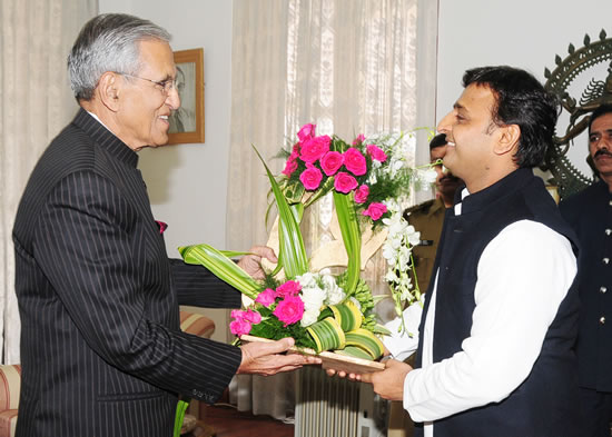 उत्तर प्रदेश के मुख्यमंत्री श्री अखिलेश यादव ने आज राजभवन में प्रदेश के राज्यपाल श्री बी0एल0 जोशी को गुलदस्ता भेंट कर नववर्ष की शुभकामनायें दी