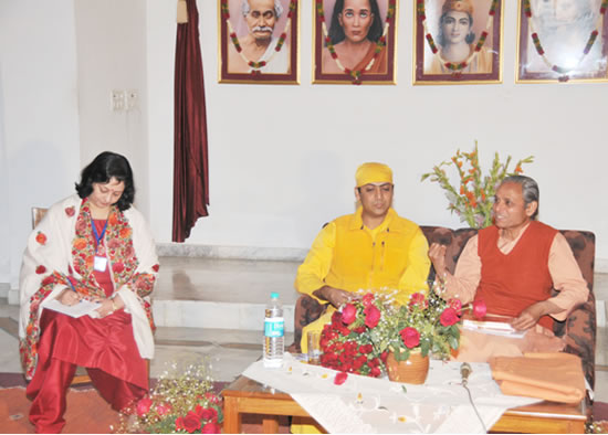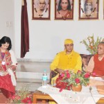 yogFrom left to right Mrs. Surabhi Ranjan, Sanyashi, and Swaami Smarna Nand Param Hansh (Extreme Right) speaking to the press at Yogoda Satsang Society Meditation Center in Gomti Nagar Lucknow.