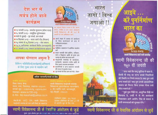 श्री भाटिया ने समारोह के विषय में बताते हुए कहा कि 12 जनवरी को शोभा यात्रा, 18 फरवरी को प्रातः 10 बजे देश के सभी विद्यालयों में सूर्य नमस्कार, माह मार्च से जुलाई तक गृह संपर्क, 11 सितम्बर को भारत जागो दौड़(मैराथन), 15 नवम्बर से 15 दिसम्बर सेवा साधना, 25, 26, 27 दिसम्बर को कार्यकर्ता शिविर कन्याकुमारी में, 12 जनवरी 2014 को समापन कार्यक्रम मानव श्र्ृंखला बनाकर किया जायेगा।