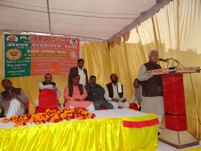today_samiksha_baithek_2 पार्टी की राज्य र्इकार्इ के प्रवक्ता विजय बहादुर पाठक ने बताया कि पार्टी द्वारा आयोजित ßअटल शंखनाद रैलीß में पार्टी के राष्ट्रीय अध्यक्ष नितिन गड़करी , पूर्व राष्ट्रीय अध्यक्ष डा0 मुरली मनोहर जोशी, पूर्व राष्ट्रीय अध्यक्ष एवं पूर्व मुख्यमंत्री राजनाथ सिंह सहित कर्इ अन्य केन्द्रीय नेता व  उ0प्र0 के पार्टी के सभी वरिष्ठ नेता सभी पूर्व प्रदेश अध्यक्षों, युवा मोर्चा के राष्ट्रीय अध्यक्ष अनुराग ठाकुर एवं महिला मोर्चा की राष्ट्रीय अध्यक्ष स्मृति र्इरानी सहित पार्टी के कर्इ वरिष्ठ केन्द्रीय नेता एवं पदाधिकारी उपसिथत रहेंगे। उन्होंने बताया पूर्व राष्ट्रीय अध्यक्ष एवं पूर्व मुख्यमंत्री राजनाथ सिंह 18 जनवरी को लखनऊ आयेंगे व 21 जनवरी को रैली में समिमलित होंगे। श्री पाठक ने कहा उत्तर प्रदेश में समाजवादी पार्टी की सरकार बनने के बाद से आम जनता दहशत के वातावरण में जी रही है। पूरे प्रदेश में अनाचार, दुराचार व अपराध का ग्राफ दिनों दिन बढ़ रहा है। प्रदेश में सत्ता के कर्इ केन्द्र होने के कारण मुख्यमंत्री सहित वरिष्ठ अधिकारी भी अपनी जिम्मेदारियों से बच रहे है। वोट बैंक की लालच में राज्य सरकार तुषिटकरण की पराकाष्ठा कर रही है। जनता के धन को सरकार अपने वोट बैंक के ऐजेण्डे को ध्यान में रखकर लुटा रही है। कल्याणकारी योजनाएं सिर्फ वर्ग विशेष के लिए बनायी जा रही है। ऐसे में पार्टी आम जन की आवाज को ßअटल शंखनाद रैली के माध्यम से उठायेंगी। राज्य में सपा सरकार की जनविरोधी नीतियों एवं राज्य में बढ़ते अपराध के खिलाफ आम जन की लड़ार्इ की शुरूआत रैली के माध्यम से होगी।