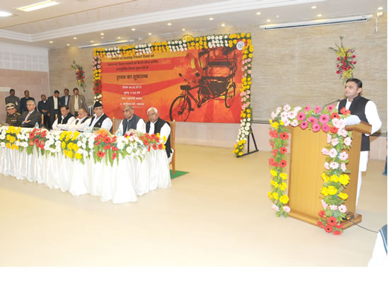 upcm-2उत्तर प्रदेश के मुख्यमंत्री श्री अखिलेश यादव 9 फरवरी, 2013 को लखनऊ में आयोजित रिक्शा चालकों को बैटरी/मोटर चलित अत्याधुनिक रिक्शा मुफ्त देने के ट्रायल के शुभारम्भ कार्यक्रम को सम्बोधित करते हुए।