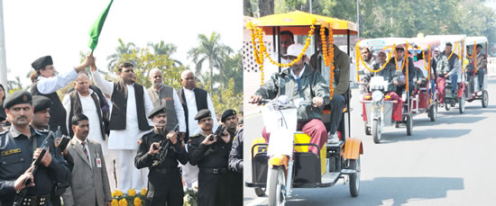 upcm-4उत्तर प्रदेश के मुख्यमंत्री श्री अखिलेश यादव एवं नगर विकास मंत्री श्री मोहम्मद आजम खाँ  9 फरवरी, 2013 को लखनऊ में रिक्शों को झण्डी दिखाकर बैटरी/मोटर चलित अत्याधुनिक रिक्शा मुफ्त देने के ट्रायल का शुभारम्भ करते हुए।